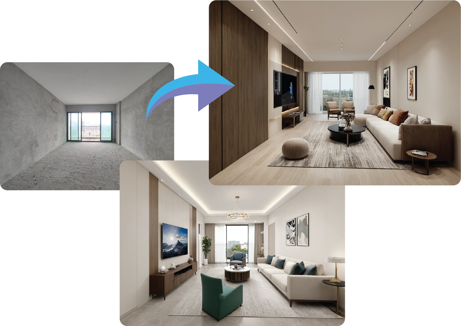Bring any space to life — interior, exterior, empty, or outdated — with real products and polished styling.